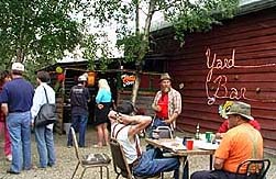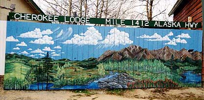 The Cherokee Lodge was first started during the pipeline. After the state’s interest in developing the agricultural community in this area, the Cherokee fast became known as “the Farmer’s Bar” because of it’s location - about 15 miles out of town on the Alaska Highway in the heart of the “Barley Project”....although other locals who are willing to travel and dodge troopers on the way home, still find it a fun place to let it all hang out! For the Yak Attack, a convenient yard bar was made outside behind the mural........