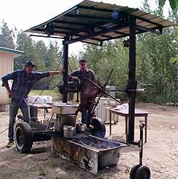 Back to the story! The yak on the spit appeared to be the size of a good-sized caribou, but I was told by the “Chefs”, Wayne and Charles (Wayne is the one on the left), it was a young animal. This extraordinary Bar-B-Q pit was the product of their ingenuity to make do with items on hand - or what is commonly called “plan B” up here. Sometimes, I look at the ads on TV, etc, and have to smile when they show their LARGE MODEL rotisserie :0) This monjobi was obviously built by men who have lived in the “bush” for awhile. Using a bathtub for a fire pit seemed to epitomize the phrase “recycle!!!