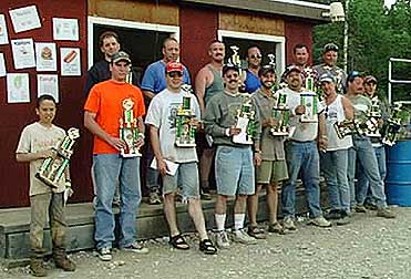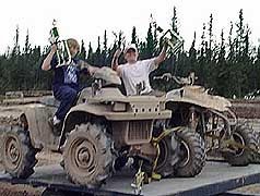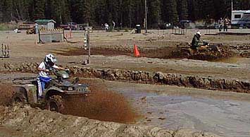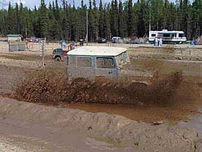 And this race, the Northern Warfare Training Center at Ft. Greely supplied our "retrieve" vehicle As a matter of fact, the whole team that puts these races on is done by volunteers - from getting the pits ready (2 side-by-side 22' wide by 200' long mud holes) to working the concession stand, staging the vehicles, announcing, etc, etc, etc.........it is a wonderful group! 3 and 4 wheelers are popular, and they get the first crack at the mud Being truly Alaskans and devoted to their snowmachines, some of our racers have found a way to enjoy them in the summer, too!! They are the next to test their skills. These are followed by the truck classes 1 - 4. I'm not really sure what the differences are, but I think 1 - 3 have to do with engine size, ...and 4 is as bad as you want to get or mostly, how much you can afford. :0)